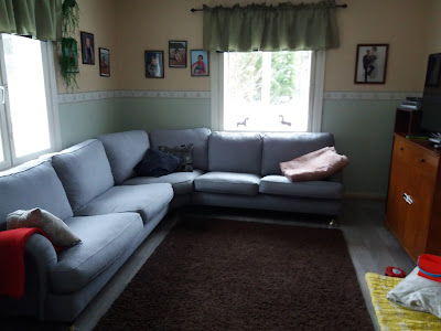 Mies teki olohuoneeseen pienen pintaremontin.Katto maalattiin ja lattiaan tuli uusi matto.Iso akvaario siirtyi tuvan puolelle ja pienempi laitettiin myyntiin.Muutos sai alkunsa siitä,että meidän perhekoko tällaisenaankaan ei enää mahtunut kunnolla sohvailemaan yhtäaikaa.Vanha sohva lahjoitettiin ja uusi löydettiin nettikaupasta etsintöjen jälkeen.